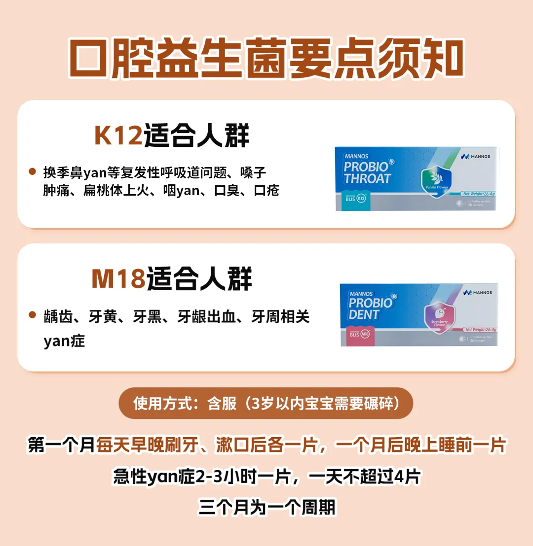 口臭、口腔小点点,或者有慢性鼻火火、咽火火、中耳火火等耳鼻喉问题的,一定选K12,它可以高效快速精准抑制口腔中常见的9种有害菌,达到平衡菌群、抗菌消火火的作用。