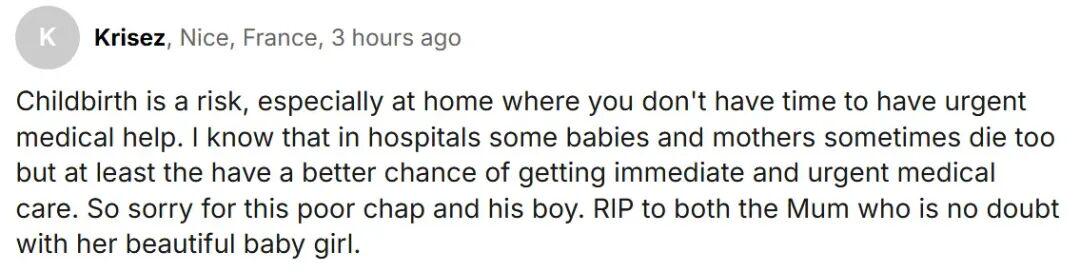“分娩本身就存在风险,尤其在家时,一旦出现紧急情况,都没时间获得及时的医疗救助。我知道,即使在医院也会有婴儿和母亲不幸离世,但至少在那,他们有更好的机会获得及时而紧急的医疗救治。我为这个可怜的男人和他的儿子感到难过。愿这位母亲和她美丽的女儿安息,她们正相聚于另一个世界。“
