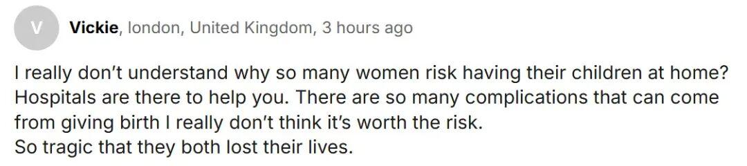 “我真的不明白,为什么有那么多女性要冒险在家分娩?医院的存在就是为了帮助你。分娩时可能出现的并发症实在太多了,我真觉得不值得拿命去冒险。真的太悲惨了,母女二人都失去了生命。”