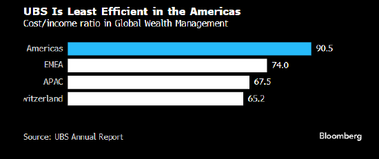 美洲地区是瑞银旗下财富管理部门成本收入比最高的地区。瑞银首席执行官Sergio Ermotti此前表示,该公司的成本与同行相比规模更大,但能力却不及对手,这降低了人们对其能够缩小与摩根士丹利等华尔街巨头差距的预期。