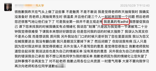 在这段话中,她特别指出自己患有“adhd”,称自己有精神类的疾病,无法集中注意力。