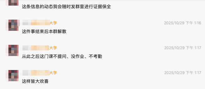 自此,老师宣布,这件事结束之后,群解散,从此这门课不提问,无作业,不考勤,这样“皆大欢喜”。